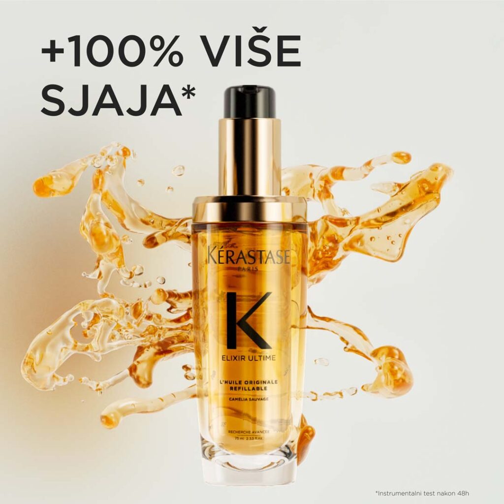 Kérastase Elixir Ultime Refillable hidratantno, višenamensko ulje za kosu. Jedinstveni proizvod koji pruža luksuzno iskustvo za vašu kosu. Njegova formula se sastoji od kombinacije divlje i francuske kamelije, ručno ubrane u Bretanji. Izvučene su jedinstvenim hladnim procesom, tako da su sačuvani svi aktivni sastojci. Ulje ima laganu teksturu koja pruža blistav sjaj i neodoljiv miris koji će osvojiti vaša čula. Može da se koristi kao tretman pre pranja kose ili za zaštitu kose prilikom upotrebe vrućih aparata za stilizovanje do 230°C. Olakšava stilizovanje kose, a takođe je idealno i kao završni korak, jer čini kosu glatkom i sjajnom. Ovaj proizvod može da se koristi kao dodatak bilo kojoj Kérastase rutini.