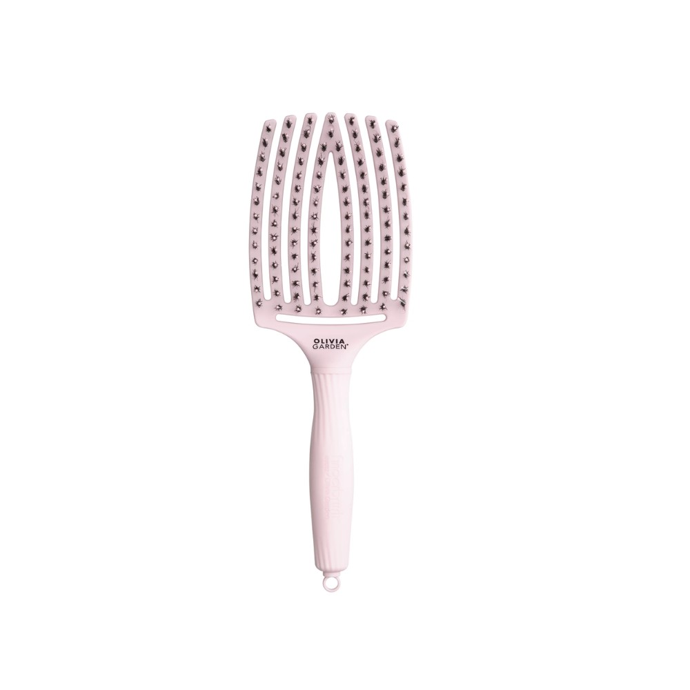Olivia Garden Fingerbrush Combo velika četka za kosu. Očešljajte zamršenu kosu lako i bezbolno. Ova profesionalna četka sadrži kombinaciju najlonskih i veprovih iglica i ima jedinstveni dizajn u obliku ljudske ruke. Blago je zakrivljena, savršeno se prilagođava prirodnom obliku glave i raščešljava najzamršenije delove kose i povećava prirodni sjaj. Zbog svoje velike površine idealna je za feniranje, stilizovanje i svakodnevnu negu. Zaobljene, antistatičke iglice sprečavaju statički elektricitet i nežne su prema koži glave. Omogućava veći protok vazduha i ubrzava sušenje kose. Izuzetno lagana i udobna drška četke je prijatana i mekana za ruku. Četka je dostupna u pastelno roze boji.