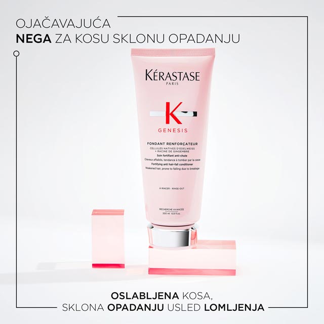 Kérastase Genesis Fondant ojačavajuća nega za kosu sklonu opadanju usled lomljenja. Pruža trenutnu snagu, mekoću i sjaj. Ima kremastu teksturu, koja ne otežava dlaku. Bogata formula olakšava raščešljavanje, regeneriše vlasi i čini ih otpornim na svakodnevna oštećenja, kako bi se smanjio rizik od opadanja kose. Obogaćen je kombinacijom biljnih ekstrakta, koji pružaju intenzivnu hidrataciju i negu. Kosa ostaje ojačana, zaglađena i sjajna.
