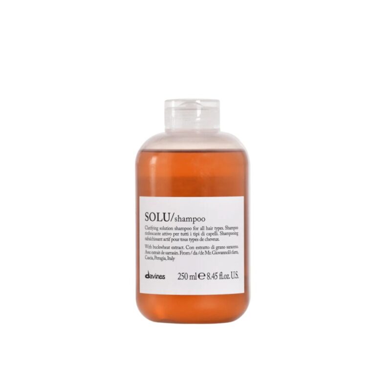 Davines Solu šampon bez sulfata, za dubinsko čišćenje kose. Ovaj šampon nežno i efikasno uklanja sve tragove nečistoća sa vaše kose i kože glave. Bogata pena obezbeđuje izuzetno čistu kosu uklanjanjem nečistoća, zagađivača, višak sebuma i naslage proizvoda i na taj način omogućava optimalan učinak vaše rutine negovanja kose. Intenzivno hidrira kosu i kožu glave kako se ne bi narušila prirodna ravnoteža. Idealan je za pripremu kose pred hemijski tretman. Jača strukturu vlasi i povećava prirodni sjaj. Formulisan je bez štetnih sastojaka i veštačkih mirisa, a ambalaža je napravljena od recikliranog materijala.