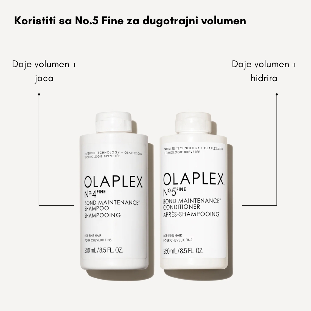 Olaplex No.4 Fine Bond Maintenance šampon bez sulfata, za volumen tanke kose. Ovo je idealan proizvod za svakodnevnu negu kose. Klinilki je dokazano da ovaj šampon jača i obnavlja kosu spolja i iznutra. Takođe štiti od oštećenja izazvanih svakodnevnim štetnim agresorima okoline, stilizovanjem vrućim aparatima ili hemijskim tretmanima. Efikasno uklanja sve tragove nečistoća, ostatke proizvoda i masnoću i povećava prirodni volumen iz korena, sa dugotrajnim efektom. Povećava bujnost i elastičnost dlake, bez dodatnog osećaja težine i bez isušivanja. Proizvod je pogodan za svakodnevno pranje.
