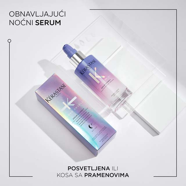 Kérastase Blond Absolu obnavljajući, noćni serum za sve tipove plave kose. Ovaj profesionalni proizvod ima teksturu bele kreme u gelu. Intenzivno hidira i jača plavu, suvu kosu nakon hemijskog tretmana. Regeneriše vlasi tokom noći, kako biste naredog jutra imali mekšu i vidljivo zdraviju kosu. Sadrži visoku koncentraciju hijaluronske kiseline i ekstrakt runolista, koji omogućavaju efekat bujnije kose sa zaglađenim krajevima. Ne otežava vlasi i ne ostavlja masne tragove po kosi. Probudite se sa mekšom kosom, koja se ne mrsi i ima satenski sjaj.