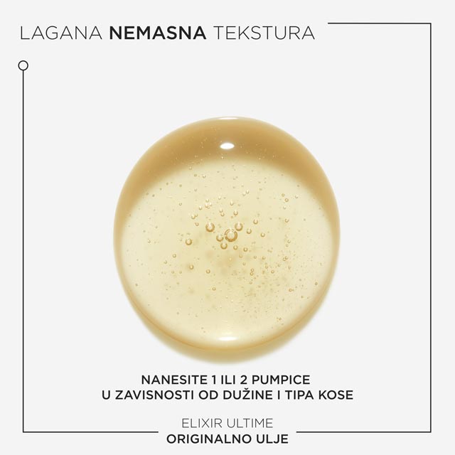 Elixir Ultime predstavlja kultnu rutinu za postizanje blistavo sjajne kose i namenjena je svim tipovima beživotne kose, bez sjaja. Obogaćena je jedinstvenom kombinacijom dragocenih ulja. Marula ulje je obogaćeno vitaminima C i D, hranljivim materijama i antioksidantima, za sjaj bez otežane dlake. Ulje kamelije pomaže pri zaglađivanju vlasi, pracaxi ulje kosi daje sjaj i regeneriše je, a ulje kukuruznih klica ima značajnu nutritivnu i zaštitnu funkciju. Nakon svake upotrebe ovih proizvoda, vaša kosa će biti intenzivno sjajna, mekana i negovana, sa neodoljivim mirisom cveća koji se zadržava u kosi.