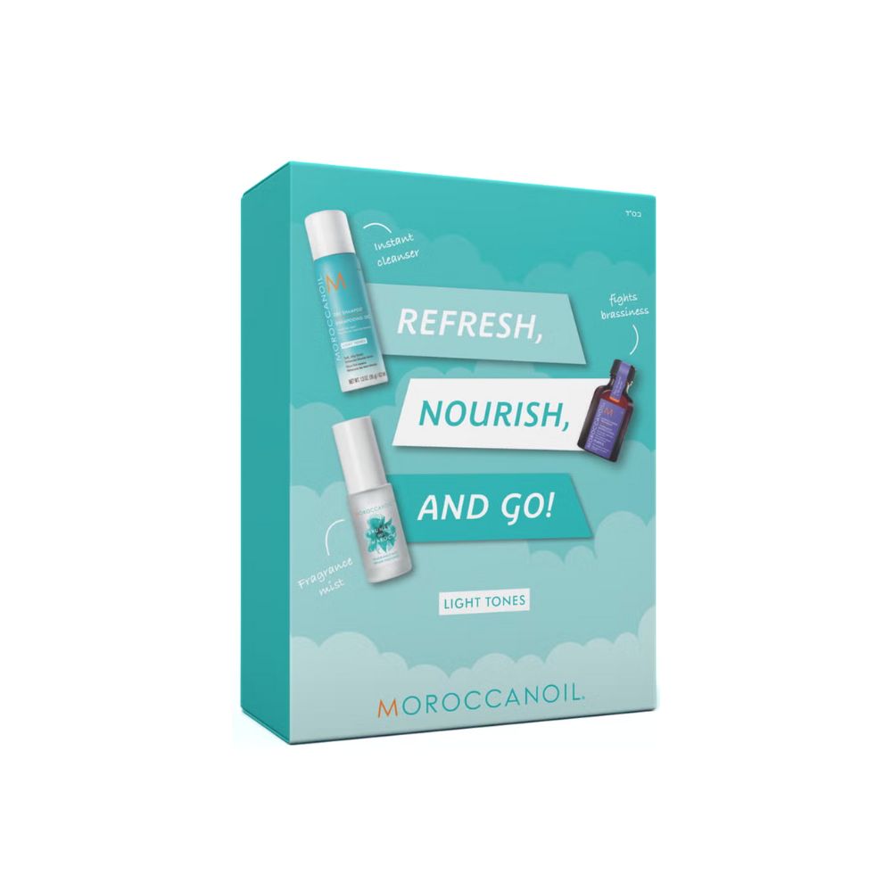 Moroccanoil Refresh, Nourish & Go Light set za negu svetle kose. Sve što vam je potrebno da osvežite kosu i pojačate njen sjaj. Set sadrži tri Moroccanoil proizvoda: