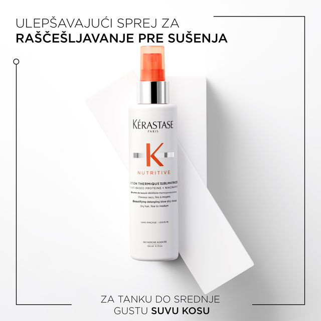 Kérastase Nutritive losion u spreju za termalnu zaštitu i raščešljavanje suve kose. Ovaj proizvod ima ultra laganu teksturu, što ga čini pogodnim za tanku do srednje gustu kosu. Formula je obogaćena hranljivim lipidima i prirodnim proteinima, koji pružaju intenzivnu negu i jačaju zaštitnu barijeru kose. Štiti vlasi od oštećenja prilikom upotrebe vrućih aparata za stilizovanje do 230°C i olakšava raščešljavanje. Pruža kosi intenzivnu hidrataciju, kontroliše nepoželjno kovrdžanje i povećava prirodni sjaj i mekoću. Vaša kosa će biti zaglađena, a njeno oblikovanje olakšano.