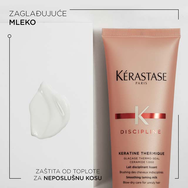 Kérastase Discipline Keratine Thermique mleko koje pruža zaštitu od toplote, za neposlušnu kosu. Pružite vašoj kosi profesionalnu negu. Ovaj proizvod je formulisan Morpho-Keratine kompleksom, koji oblaže svaku vlas, jača ih i čini kosu poslušnom. Štiti kosu tokom feniranja i stilizovanja kose do 230°C i olakšava proces sušenja kose. Ima belu, kremastu teksturu koja ne otežava dlaku. Pruža zaglađen izgled i štiti kosu od vlage do 72h. Omekšava vlasi i olakšava njihovo stilizovanje. Zahvaljujući sastojcima, koji se aktiviraju toplotom, kosa ostaje negovana i intenzivno sjajna.